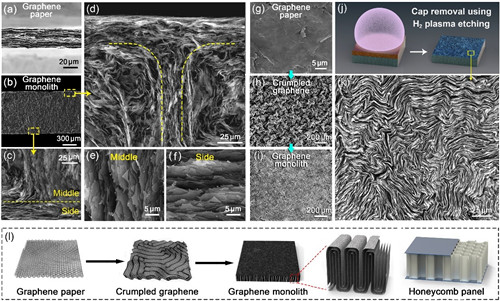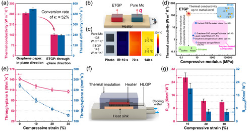 图2(a–k)为石墨烯导热垫在制备过程中各阶段的形貌变化,最终的石墨烯导热垫在微观上呈现多层结构,中间以垂直排列的石墨烯为主,顶部和底部有一薄层水平排列的石墨烯,整体结构与蜂巢板类似(如图2(l))。实验所用的作为原料的石墨烯纸的面内热导率为273Wm-1K-1,经过结构转制之后所得到的石墨烯导热垫的纵向热导率为143Wm-1K-1(转化率达52%),已经超过了大多数的金属(如Mo、Zn、In、Ni、Fe等),相应的结果见图3(a–d)。除了拥有高的导热系数,该石墨烯导热垫还具有与硅胶相当的压缩模量,仅有0.87MPa,远低于金属材料(图3d),有利于在封装时产生变形,实现较低的接触热阻。在30%压缩率下,石墨烯导热垫的面外热导率仍超过了100Wm-1K-1,接触热阻低至5.8Kmm2 W-1,如图3(e–g)所示。
