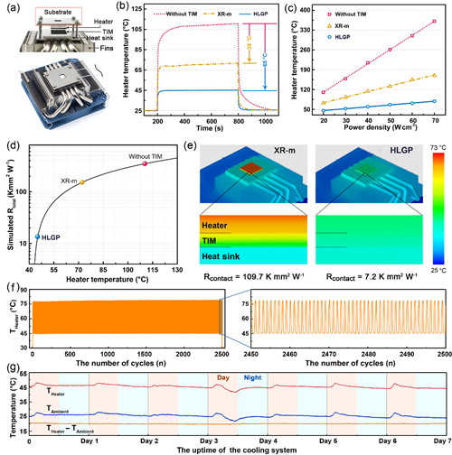 在实际的热界面性能评测实验中,以石墨烯导热垫作为热界面材料的系统热源温降达到65℃,远高于应用商用热界面材料所实现的温降(38℃),实验结果如图4(a–c)所示。图4(d–e)为CFD仿真软件对散热过程的模拟,结果显示石墨烯导热垫的接触热阻低于主流的商用导热垫。在图4f中,石墨烯导热垫表现出了良好的热循环稳定性,在经过2500次热冲击测试后散热性能波动低于0.5%;除此之外,该石墨烯导热垫还具有长时稳定性,在20Wcm-2的功率下连续工作7天,加热片与环境温度的差值无明显变化(图4g),显示出良好的热冲击稳定性以及长程稳定性。目前相关工作已经发表在ACS Nano (2019, DOI: 10.1021/acsnano.9b05163)。该研究工作获得国家重点研发计划(2017YFB0406000)、中科院战略重点研究计划(XDA22000000)、中科院装备(YZ201640)、宁波市重大专项(2016S1002和2016B10038)以及宁波市国际合作(2017D10016)的资助。