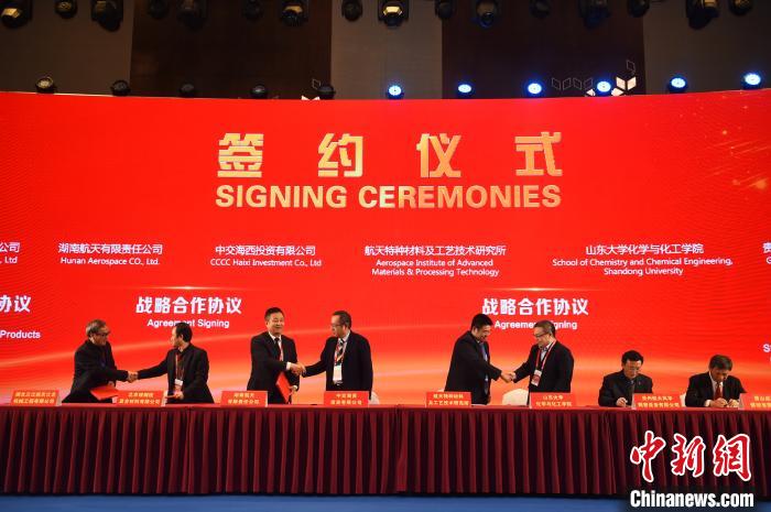 第三届新材料新工艺高峰会议现场举行多项签约仪式,航天科工所属三院、航天三江、湖南航天等单位将与北京玻璃钢研究院、中交海西投资有限公司等企业和单位在增材制造、高性能隔热材料等领域开展深入合作。供图