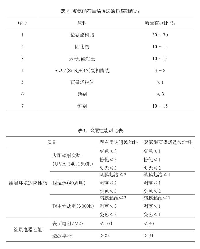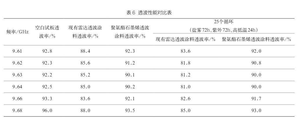 将新研制的聚氨酯石墨烯透波涂料与现有的雷达透波防护涂料制作试板后进行常规环境适应性、电气性能和人工加速老化后电气性能进行比较(测试数据见表5、表6),从测试数据可以看出,石墨烯可以大幅度延长涂层的防护效果,有效提高涂層的电导率和透波率,并且经过长时间老化后,涂层仍保持良好的透波效果,防护效果明显。