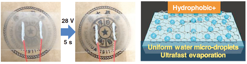 图1 除雾器除雾前后的效果图及褶皱石墨烯表面形成均匀分布微水滴的机制示意图