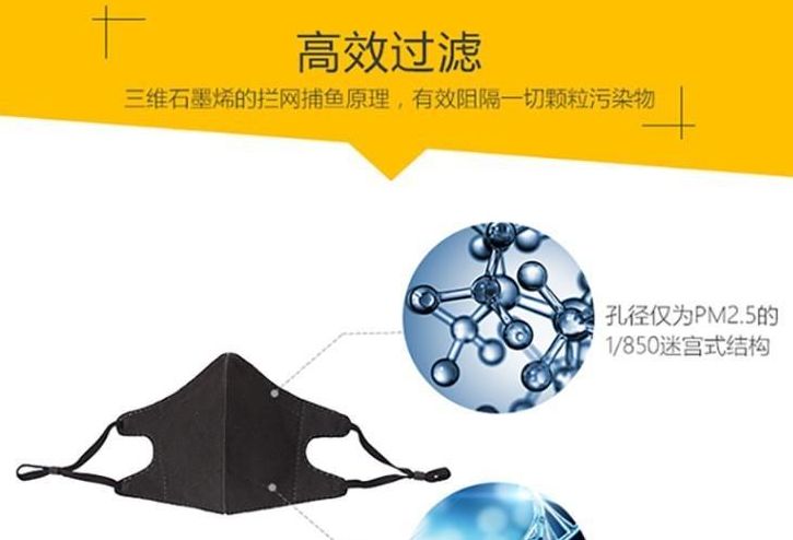 至于这些宣称里面加了石墨烯的产品到底用了什么,就只能是个“大家猜猜看”的娱乐活动了。已经用烂了的抗菌内裤之类的就算了,还有比如宣称能吸附细菌病毒的石墨烯口罩,所谓的多孔超大比表面积的核心技术,其实就是将活性炭口罩换个称呼。这些碳粉口罩并不会增加防病毒能力,国家也已经说明了活性炭口罩对防病毒无意义,只能换名字了。