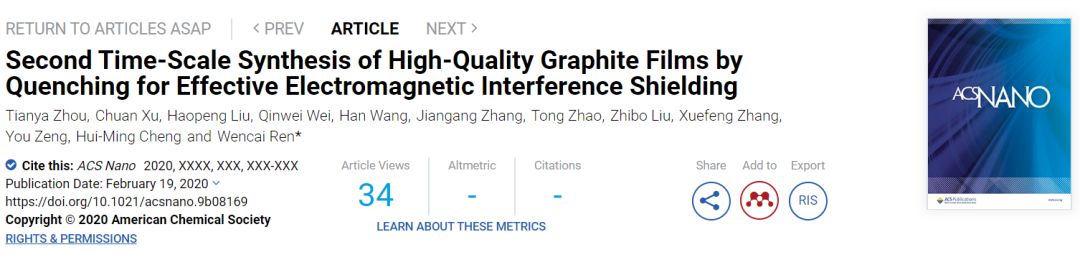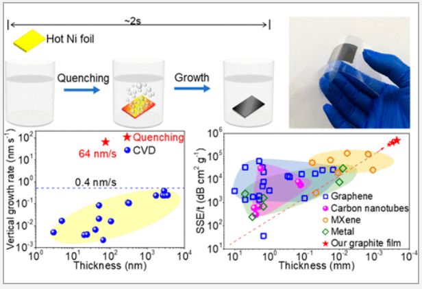 2月19日,中国科学院金属研究所任文才研究员报道了通过在乙醇中淬火热的镍箔,实现了在几秒钟内快速合成数十纳米厚的高质量石墨薄膜。通过该方法,石墨烯膜的垂直生长速率可达64nm·s-1以上,比现有方法高出2个数量级以上。此外,制备得到的薄膜具有优异的导电性(∼2.6×105s/m)和高机械强度(∼110MPa),与化学气相沉积法相当甚至优于化学气相沉积法。作者展示了这些石墨薄膜在电磁干扰屏蔽的应用潜力,它显示出高达481000 dB cm2 g–1的绝对屏蔽效能,超过了之前所有报道的合成材料。相关论文以“Second Time-Scale Synthesis of High-Quality Graphite Films by Quenching for Effective Electromagnetic Interference Shielding”为题,发表在《ACS Nano》上,第一作者为:Zhou Tianya。
