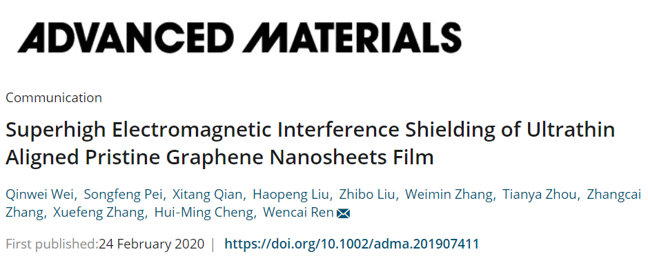 中国科学院金属研究所任文才研究员团队采用一种扫描离心铸造法高效合成了原始石墨烯负载率高达90wt%的高取向层状PG膜和仿珍珠层PG/聚合物复合材料。由于原始石墨烯纳米片的规整排列,PG膜具有高导电性和多重内反射,表现出与MXen薄膜相当的超高电磁干扰屏蔽效能(EMI-SE)。对于厚度约为100μm的PG膜,EMI SE为93 dB,对于厚度约为60μm的PG/聚酰亚胺复合膜,EMI SE为63 dB,这种PG纳米片基薄膜具有高机械强度(~145MPa)和高热导率(~190W m-1K-1),超越同类MXene薄膜。这种膜综合性能优异,易于批量加工,为PG纳米片在电磁干扰屏蔽材料中的实际应用铺平了道路相关论文以“Superhigh ElectromagneticInterference Shielding of Ultrathin Aligned Pristine Graphene Nanosheets Film”为题,发表在《Advanced Materials》上。第一作者为:Wei Qinwei。