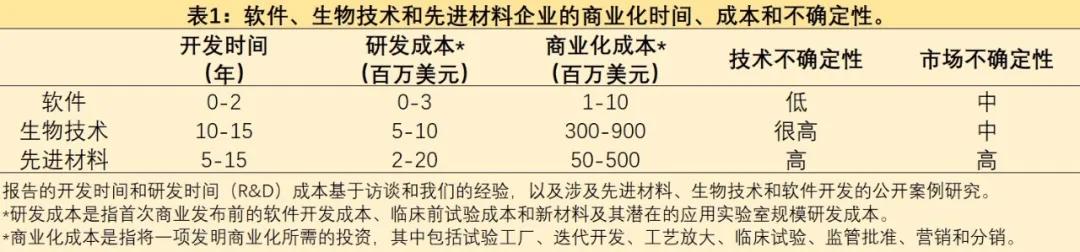 为什么风险投资家和跨国公司会对先进材料初创企业投资?与软件风险投资相比,这项投资的挑战性实在要大得多,材料类的风险投资通常在很长一段时间内面临技术和市场的双重不确定性,以及在不确定性得到解决之前的高成本投入。先进材料投资通常面临的商业化成本、时间表、技术水平和市场的不确定性与生物技术投资大体相似,与软件行业投资面临的商业化成本、时间线和市场不确定性形成鲜明对比(表1)。对于生物技术而言,临床试验涉及的高昂费用和极高的技术不确定性,并且涉及医疗标准变化的市场风险。对于先进材料技术而言,高商业化成本涉及放大生产工艺以及定制产品的设计和开发。因此,与涉及开发新药的生物技术企业一样,开发新材料的企业往往在很长一段时间内面临高度不确定性,可能需要数亿美元才能使产品商业化。