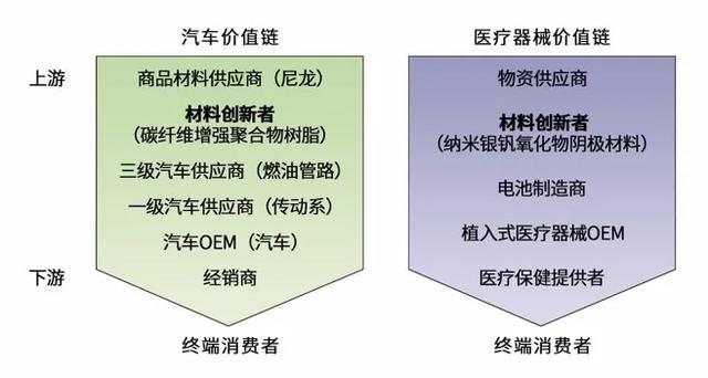 图1|在价值链中的位置。在许多行业的价值链中(这里以汽车和医疗器械行业为例),材料创新者正在从上游(远离最终消费者的地方)将其技术商业化,这增加了市场的不确定性,并使技术的采用复杂化。原始设备制造商(OEM)很少是材料创新的发起者。