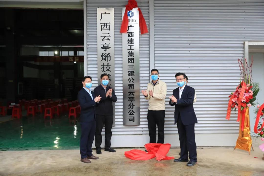 县委书记何世恰、副县长李伟明、广西建工集团三建公司董事长欧志永、广西云亭烯技术有限公司董事长侯树亭共同为公司成立揭牌。