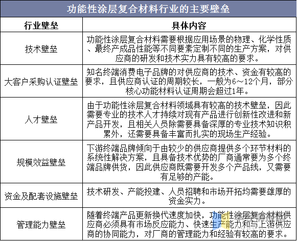 功能性涂层复合材料是高进入壁垒行业。该行业兼具技术密集、资金密集的特点,企业既需要资金实力、管理和技术能力,同时业界声誉、大客户的采购认证、购销网络的构建都需要花费较大的时间进行积累,新进入企业若没有相关积累的话发展会较为困难。