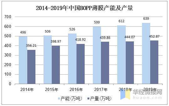双向拉伸聚丙烯薄膜(BOPP)是功能性涂层复合材料生产所需的原材料之一。目前我国已是全球主要的BOPP薄膜生产国,由于终端需求增长放缓,产能过剩局面出现,但产能仍保持增长态势。数据显示,2019年,中国BOPP薄膜产能达到639万吨,较2018年增长27万吨,产量达到452.87万吨,同比增长1.98%。