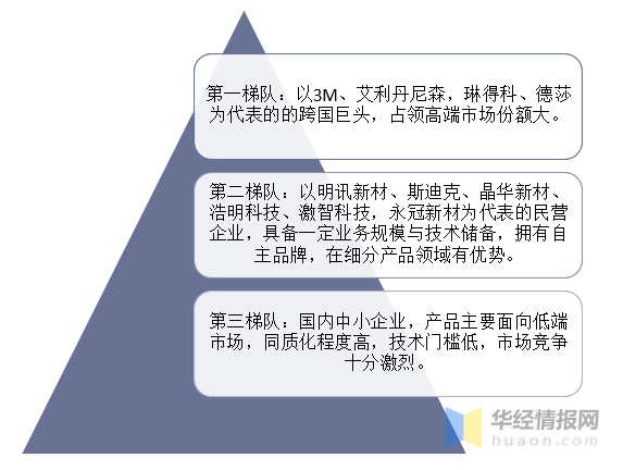 目前功能性涂层复合材料行业可以分为三个竞争层次,呈现金字塔式的层次结构。以3M、德莎、艾利丹尼森等为代表的国际知名企业技术、工艺、生产经验丰富,占据中高端市场;第二梯队主要由具有一定业务规模与技术储备,拥有自主品牌、在细分产品领域具有优势的国内大中型民营企业构成,如斯迪克、激智科技、晶华新材等。这类企业的产品品质稳定,已经被市场广泛认可。与国外优势企业相比,这类企业的产品性价比较高,并依靠本地化配套的优势,在功能性涂层复合材料中端市场及某些细分领域的高端市场中占有一席之地;第三梯队的企业多数规模小、产品种类单一且同质化程度高,竞争相对激烈。