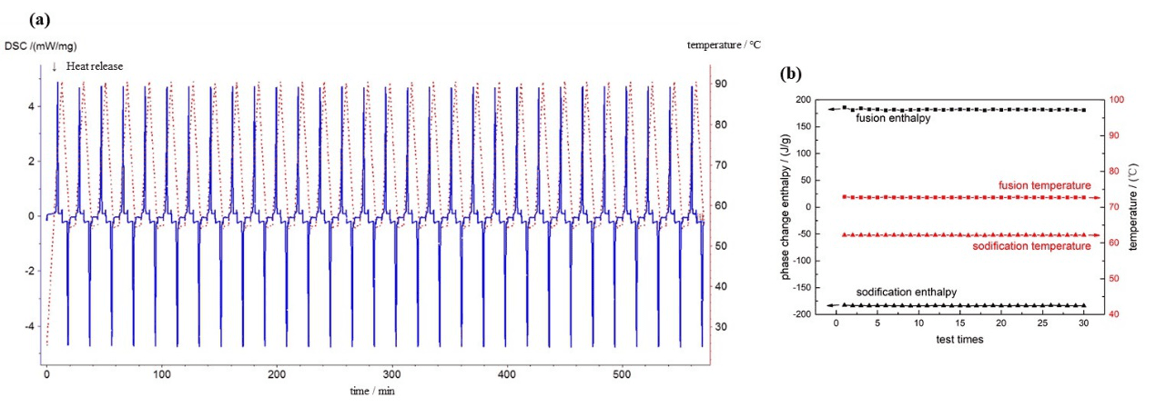 该工作开发的重力辅助浸渍工艺,极大地降低了GP与GFSAC之间的热阻,并且GP/GFSAC/GP复合材料具备更加丰富的导热机制,赋予了材料良好的导热与储热性能。另外,由于石墨烯本身稳定的化学性质,GP/GFSAC/GP复合材料具备良好的热稳定性能,在多次重复使用后,性能不会发生明显衰减。
