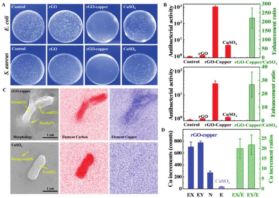 图1:石墨烯通过铜离子与石墨烯之间的离子π相互作用大量吸附铜离子,展现独特功能性:不仅快速将铜离子大量运送并富集细菌表面,而且离子π相互致使铜离子价态从+2价转变为+1,实现选择性的显著抗菌活性。