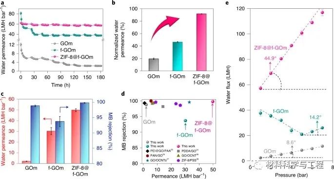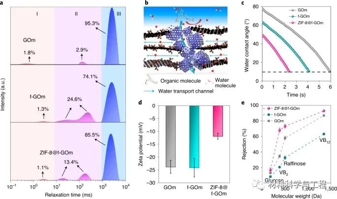 在此,研究者报道了一种高稳定性和超渗透性的层压氧化石墨烯/咪唑啉沸石骨架-8(ZIF-8)混合膜结构的设计,其中ZIF-8在GOm微孔缺陷中的受限生长稳定了骨架的微观结构,并使其能够在交叉流条件和施加的水压下长时间运行。ZIF-8在微孔缺陷中的选择性生长扩大了层间距,同时也赋予了层状框架的机械完整性,从而产生了稳定的微观结构,能够在180 h内保持60 l m−2 h−1 bar−1的水渗透性(比GOm高30倍)。此外,通过ZIF-8生长减缓微孔缺陷,使甲基蓝分子的过选择性提高了6倍。研究者利用低场核磁共振表征了膜的多孔结构,并确认了ZIF-8的剪裁生长。
