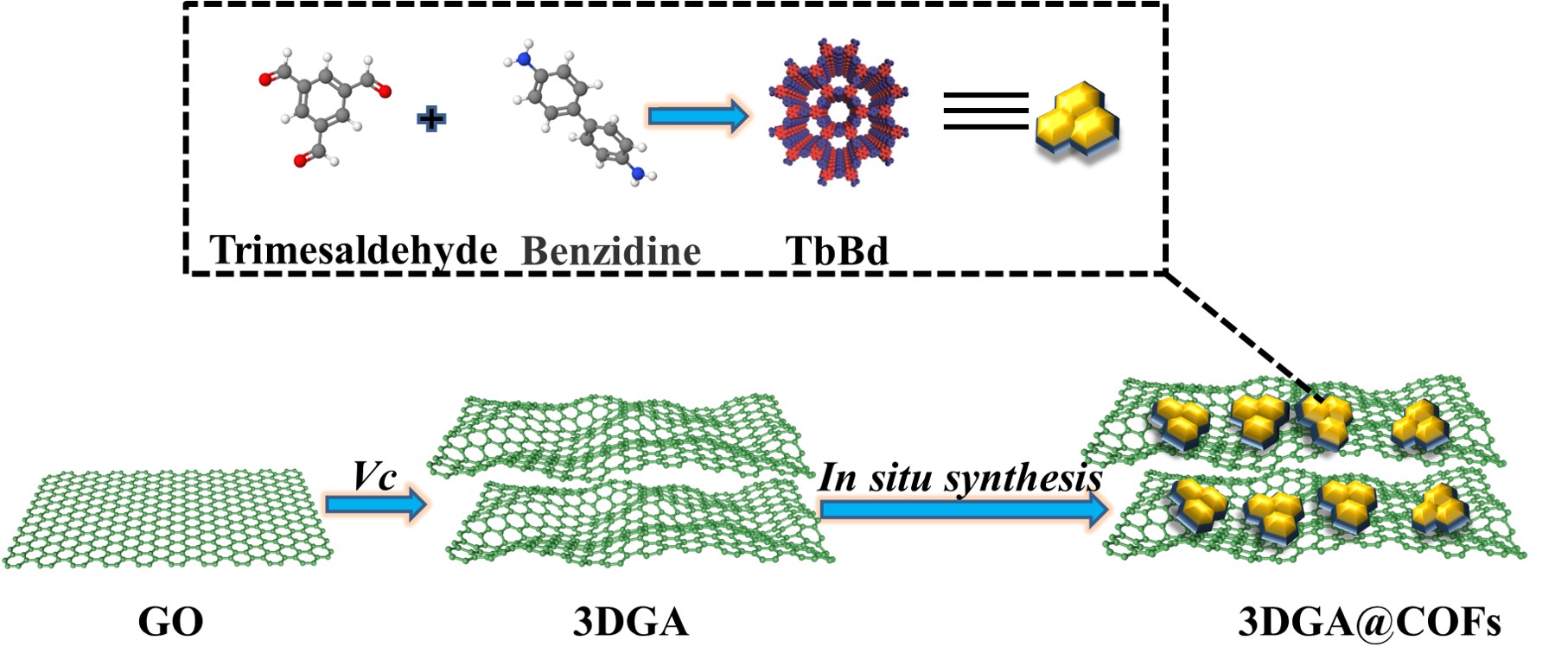通过Vc化学还原将氧化石墨烯自组装成三维石墨烯水凝胶(3DGA);利用3DGA的柔性表面引导COFs自组装生长,成功制备3DGA@COFs复合材料。