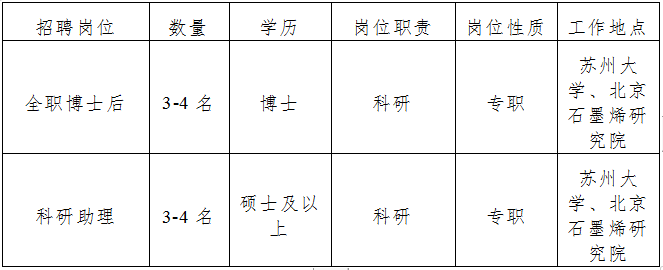 4. 全职博士后及研发助理从苏州大学入职,灵活派往北京石墨烯研究院工作。