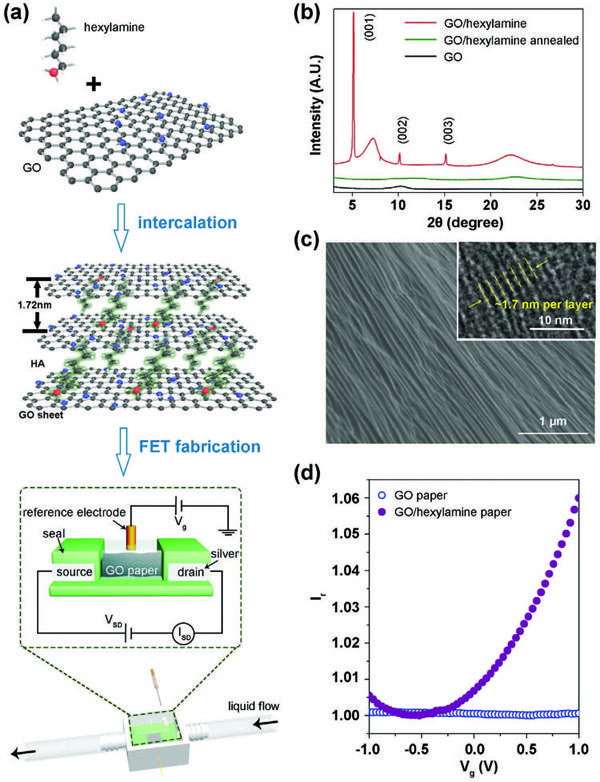 a)GO/己胺超晶格的原理模型和自制流控通道的人造FET。