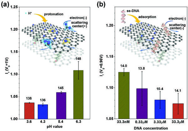 b)当Vg = 0.96 V时相对电流随ss-DNA浓度的变化。 上半部分说明了由ss-DNA吸附引起的散射效应。有效载流子迁移率(单位:cm2 V–1 s–1)标注在(a)和(b)中的条形上方。