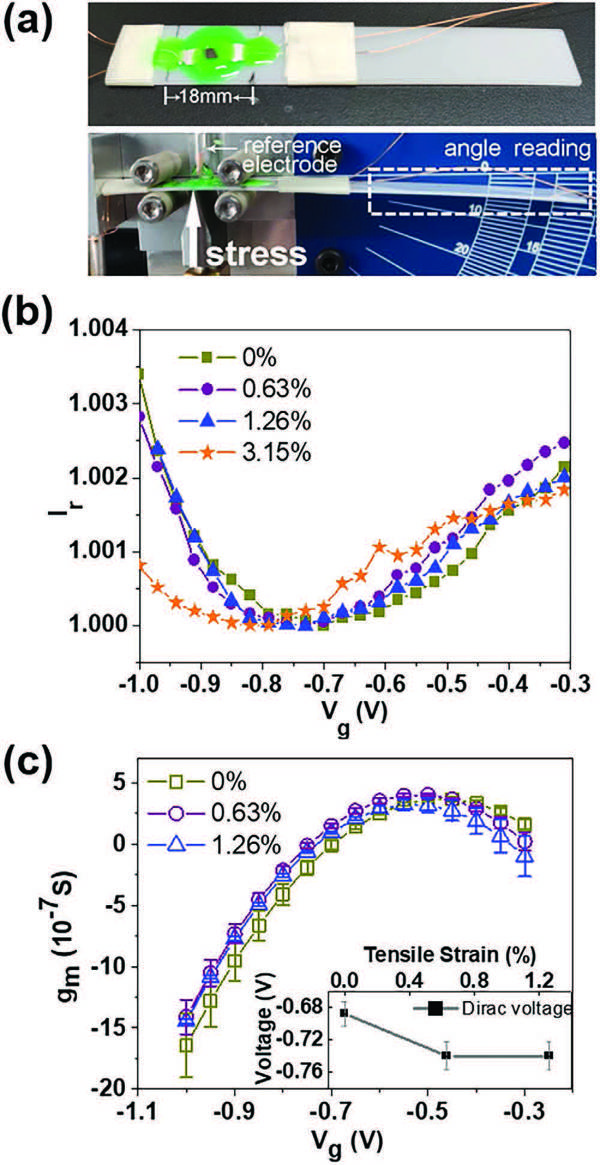 c)不同拉伸应变状态下的跨导与Vg。跨导在机械应力下保持稳定,表明具有良好的电学和传感性能。插图显示狄拉克电压与拉伸应变的关系。