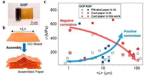 图1.石墨烯膜强度的“尺寸困境”问题。通过分析文献,在石墨烯自组装膜中存在两种相反的尺寸效应——对于抽滤制备的膜,其强度表现出与片径之间的正相关关系,而对于溶液涂覆的膜,则显示出负相关规律。