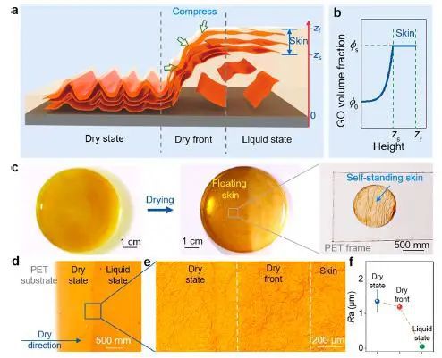 图2. 氧化石墨烯膜干燥过程中的skin效应与褶皱形成。通过实验跟踪氧化石墨烯膜的干燥过程,证实了石墨烯膜在干燥过程中会出现显著的skin效应,在其液态膜表面形成一层随干燥进行不断增厚的skin层,直接观测到随着干燥锋面向膜中心移动,skin受到空间压缩发生弯曲变形进而产生褶皱。测得在干燥锋面前后,不同膜状态(液态、干燥锋面、干态)下的表面粗糙度值(由液态到干态显著增大),揭示了膜表面褶皱形成的根源。