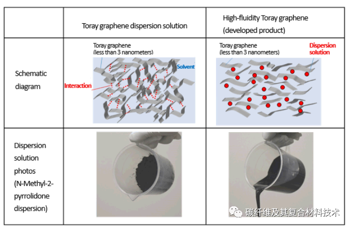 基于上述背景,东丽公司开发了一种分散技术,该技术通过添加一种独特的聚合物材料来控制粘度,而这种聚合物材料可以抑制石墨烯之间相互作用产生的聚集,其优异的结果是使得高浓度的超薄石墨烯分散液流动性增加(见下图)。该体系即使在高浓度下,流动性也极好。