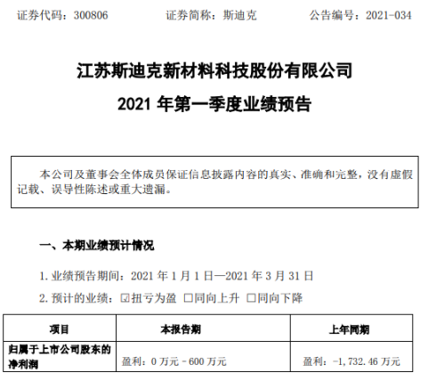 挖贝网3月31日,斯迪克(300806)近日发布2021年第一季度业绩预告,预计业绩同比扭亏为盈。报告期内归属于上市公司股东的净利润0万元–600万元,上年同期亏损1,732.46万元;较上年同期扭亏为盈。