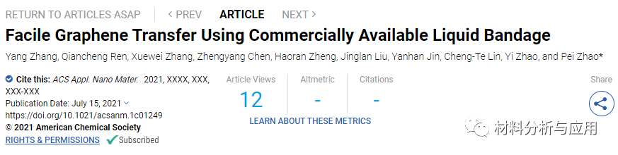 化学气相沉积(CVD)是获得高质量大面积石墨烯的最有前途的方法,但缺乏能够保持这种质量的有效转移方法,仍然是石墨烯各种应用的瓶颈。本文,浙江大学赵沛副教授课题组在《ACS Appl. Nano Mater.》期刊发表名为“Facile Graphene Transfer Using Commercially Available Liquid Bandage”的论文,研究提出了一种使用市售的 3M Nexcare 液体绷带 (LB) 转移 CVD 合成石墨烯的简便方法,该方法与传统的聚甲基丙烯酸甲酯 (PMMA) 辅助转移方法完全兼容。多项表征表明,LB 衍生的石墨烯比 PMMA 衍生的石墨烯具有更高的清洁度、平整度、完整性、电性能和更少的结构缺陷,并且 LB 的低弹性模量也使其成为将石墨烯转移到粗糙表面的理想候选者。
