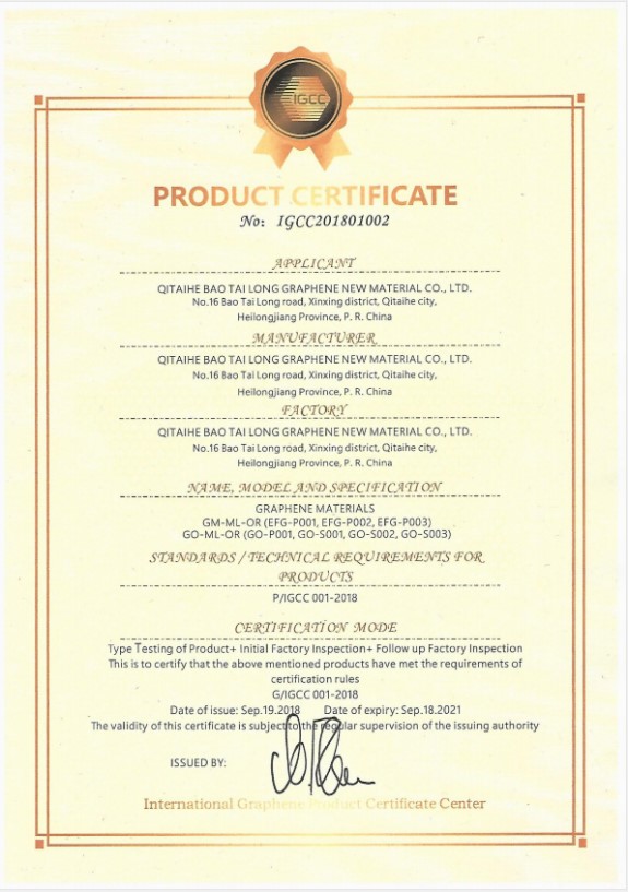 作为石墨烯NQI项目示范单位,宝泰隆对石墨烯粉体材料计量、标准、检验检测和认证等NQI技术进行全链条应用,其中石墨烯粉体产品已获得认证公司颁发的全球首批石墨烯产品认证证书。