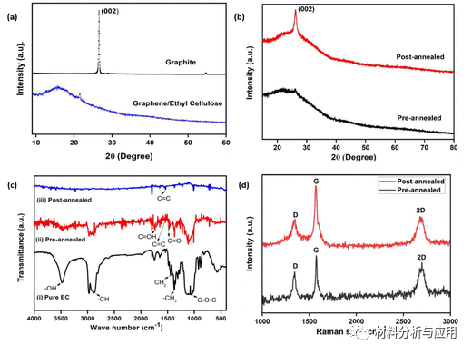 图2、石墨和石墨烯脱落/乙基纤维素粉末的X射线衍射图谱,FTIR 光谱,拉曼光谱