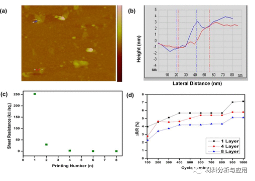 图3. (a) 石墨烯纳米片的原子力显微镜 (AFM) 图像,以及 (b) 在边缘获得的高度轮廓。(c) 石墨烯薄膜的薄层电阻随印刷循环次数(表示为印刷次数)的变化。(d) 电阻 Δ R / R (%) 随聚酰亚胺基板上不同印刷石墨烯层的循环次数的变化。