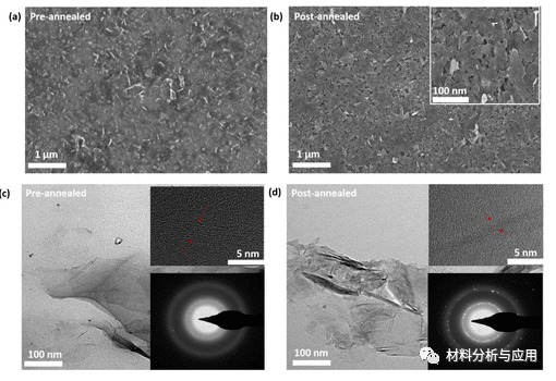 图4. (a) 预退火和 (b) 后退火(在 350 °C)条件下(在较低和较高放大倍数下)打印的石墨烯薄膜的 SEM 图像。(c) 退火前和 (d) 退火后石墨烯薄膜在较低和较高放大倍数下的 TEM 图像,以及相应的选定区域衍射图。