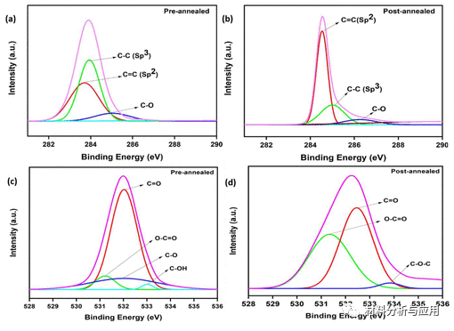 图 5. 使用印刷的预退火和后退火石墨烯薄膜获得的 XPS 光谱,分别显示(a 和 b)C 1s 和(c 和 d)O 1s 光谱。