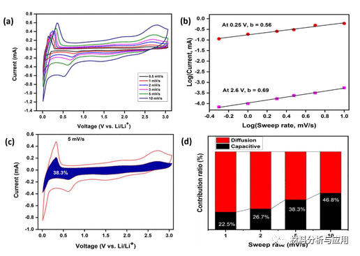 图6、 (a) 在 0.1 到 10 mV/s 之间的电位扫描速率下用印刷石墨烯薄膜电极获得的循环伏安图。(b) log( i ) 与 log(ν) 的关系图,用于确定对应于 ~2.6 和 ~0.25 V 的阳极电流响应的参数b的值(作为几个例子)。(c) 在用于以一种扫描速率(即 5 mV/s)进行循环伏安法的整个电位窗口上绘制表面电荷存储(如蓝色填充区域)和扩散控制的大容量存储的相对贡献.(d) 电容和扩散对扫描速率的贡献率。