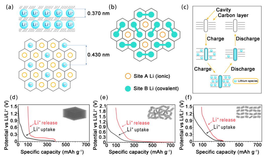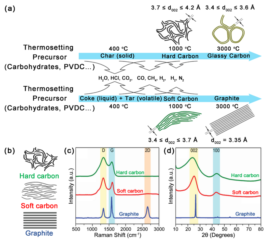 热化学转变在硬碳形成过程中至关重要。对于易石墨化的含碳原料,其转化过程一般可分为热解、炭化和石墨化三个阶段。而由于硬碳前驱体中存在分子交联及共价C-O-C键等结构,导致其在热解过程中更易形成刚性交联结构,并产生大量的缺陷、微孔和含氧官能团等。这些结构在炭化阶段会抑制石墨烯片生长与取向堆垛,并形成大量随机分布的弯曲石墨烯片。即使在3000℃乃至更高的温度下,材料也不会形成石墨,只能形成短程有序、长程无序的石墨微晶结构。因此,与石墨和软碳相比,硬碳表现出最低的石墨化度。