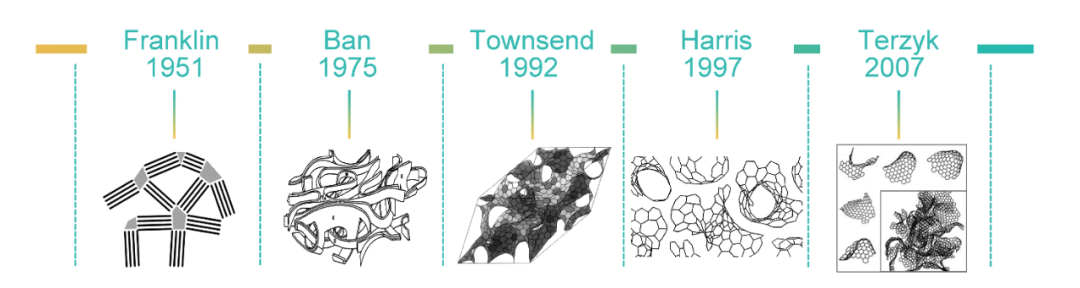 硬碳不像石墨具有统一的结构模型。受不同前驱体和制备条件的影响,硬碳实际结构十分复杂,很难构建一个通用模型。1951年Franklin认为硬炭由一些随机排布、局域石墨化结构构成,并被无定型炭连接起来。之后,Ben在1975年提出硬炭是由一些相互交错、弯曲、类似石墨化带的卷绕结构组成,但该模型无法解释为何随温度升高,硬碳不能进一步石墨化。Harris在1997年又提出硬炭类似于泡沫类的各向同性三维结构,所形成的微孔壁由类富勒烯结构的弯曲碳层构成,其中既有五元环,又有六元环。五元环使得碳层弯曲而非规整,进一步高温处理也不能石墨化。近年来,尽管在硬碳结构模型研究方面取得了新进展,但对其结构和性质的理解仍有待深化,诸多模型尚需更可靠的证据支撑。