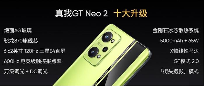 9月22日下午,智能手机品牌realme 真我正式发布新品——realme真我GT Neo2。作为打游戏的主力机,realme真我GT Neo2不仅带来“黑薄荷”外观设计,还搭载骁龙870处理器与金刚石冰芯散热系统组合,同时还配备了5000mAh超大容量电池与65W闪充组合,整机重量仅为199.8g。