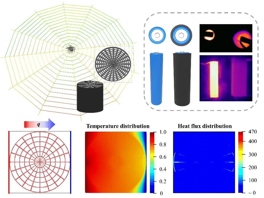 相变材料可用于高效的热能收集,在热管理和能量储存方面具有巨大的应用潜力。然而,相变材料普遍存在导热性能差、高温下易泄漏等问题。构筑三维多孔导热结构可有效提高相变材料的导热性能,同时多孔结构可将熔体束缚在框架内,从而提高材料在高温下的热稳定性与形状稳定性。此外,三维仿蜘蛛网状导热结构网络密度大,导热增强效率高,可使相变复合材料在导热性能提升的同时,仍然保持其高热容的特质。上海交通大学黄兴溢课题组采用碱诱导、自组装法,并借助径向冷冻铸造技术和真空浸渍法制备了一种具有仿蜘蛛网状导热结构的有机相变复合材料。经分析发现,该导热结构表现出高导热增强效率,且几乎不影响相变材料的相变行为,同时起到支撑和吸附作用,赋予复合相变材料良好的形状保持能力及热稳定性。此外,将该材料应用于电池的热管理中,可明显降低运行电池的表面温升,显现出良好的应用前景。