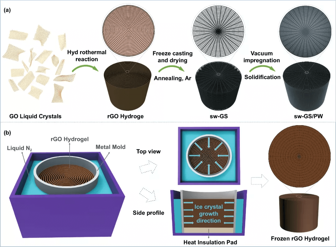 利用氧化石墨烯(GO)的液晶特质,通过碱诱导、水热自组装法制备了高取向的三维同心环状GO水凝胶。并借助径向冷冻铸造技术,将同心环状结构诱导成仿蜘蛛网状的三维石墨烯骨架(sw-GS)。经热处理后,通过真空浸渍法,将 sw-GS引入至石蜡中,成功制备具有高密度导热网络的相变复合材料(sw-GS/PW)。制备过程及径向冷冻铸造原理如图1所示。