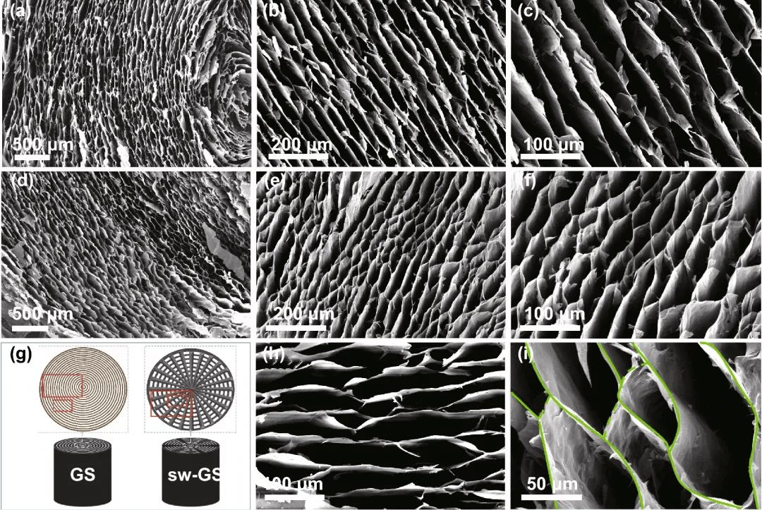 图1. (a-c, h) 同心环状导热结构与(e-f, i) 仿蜘蛛网状导热结构的SEM图像,以上形貌的观测部位见(g)中标识所示。