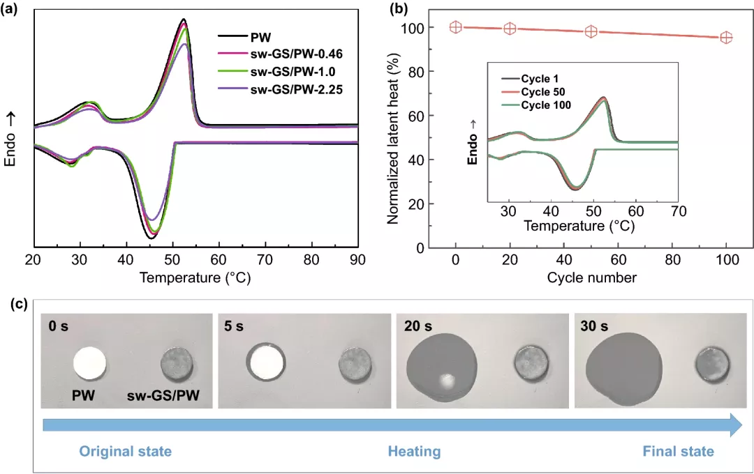 图3. (a) PW及sw-GS/PW的DSC曲线;(b) sw-GS/PW-2.25经升温、降温循环后的相对潜热变化,其中插图为sw-GS/PW-2.25经100次热循环后的 DSC 曲线;(c) PW和sw-GS/PW在65℃热台上的热稳定情况展示图。