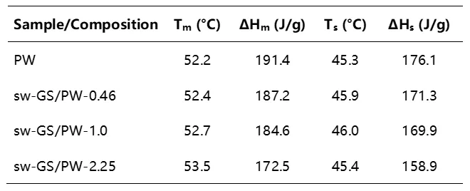 为了研究sw-GS骨架含量对相变材料性能的影响,作者制备了骨架含量分别为0.46、1.0、2.25 vol.%的复合相变材料,分别记为sw-GS/PW-0.46、sw-GS/PW-1.0和sw-GS/PW-2.25,并采用差示扫描量热法来研究材料的热性质。从图3a可以观察到,三种复合材料都具有两个与石蜡基体相似的特征峰,分别在50℃和30℃附近;而由表1可以得到与纯石蜡相比,复合材料的熔融热焓和凝固焓随着sw-GS含量的增加而稍稍下降,但仍然保持在较高的数值范围内,例如,当sw-GS含量为2.25 vol.%时,复合材料的熔融与凝固焓仍能保持基体的90%以上。此外,在加入sw-GS后,复合相变材料的熔融与凝固温度无明显变化。表明低含量的三维导热骨架对石蜡的相变行为影响较小。图3b与c分别表明了该复合相变材料具有良好的热稳定性和形状保持能力。