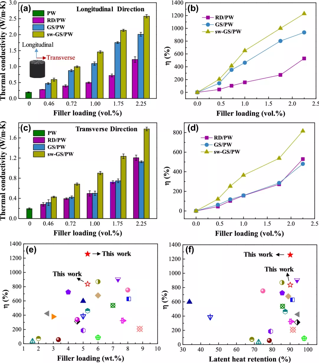 图4. 石蜡及几种复合材料纵向方向上的(a) 导热系数和(b) 导热增强率;横向方向上的(c) 导热系数和(d) 导热增强率;sw-GS/PW-2.25与其他文献中的具有低填料含量(< 10 wt.%)的相变复合材料(e) 导热增强率、(f) 潜热保留率的比较。