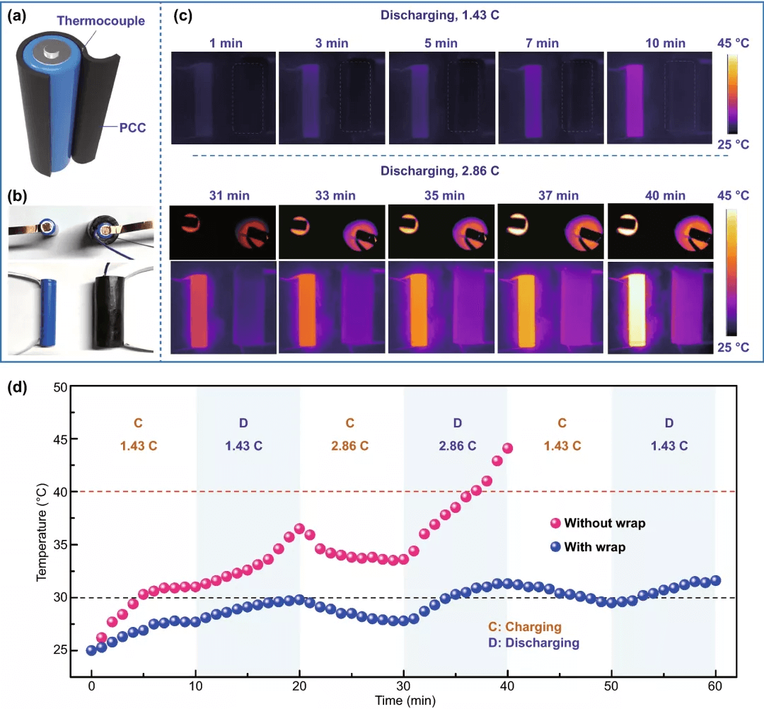 图6. (a) 外部包覆相变材料的电池组件图;(b) 电路中裸电池及被包覆电池光学照片;(c) 裸电池及被包覆电池在运行过程中的红外热像图;(d) 裸电池及被包覆电池在运行过程中其表面温度变化曲线。