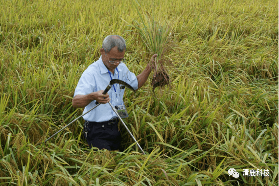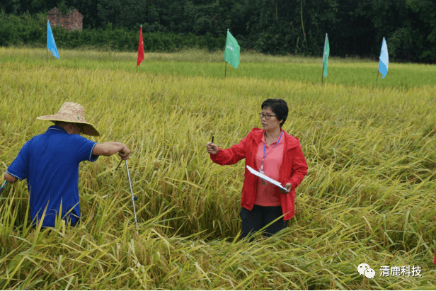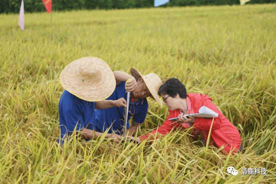 图:柳州市农业农村局技术推广中心高级农艺师谢燕青专家与清鹿工作人员测量稻谷高度