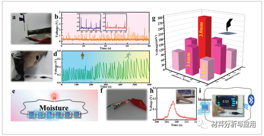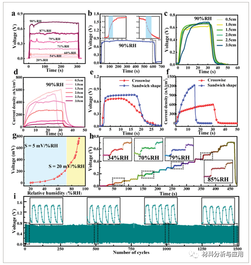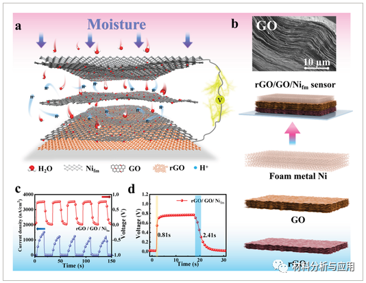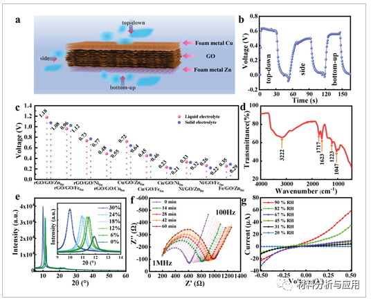 综上所述,本文提出了一种新的湿度传感机制并设计了一种具有简单的rGO/GO/泡沫金属(镍、铁、锌和铜)夹层结构的传感器系统,该传感器具有湿度感应、高响应、快速响应/恢复和高稳定性行为。此外,作者从实验和理论上证明了电位湿度传导机制的可行性和优势。有趣的是,此类传感器的性能并不取决于特定的电极材料,而是与湿度传感层的两个电极之间的电位差有关,因此具有良好的可扩展性和通用性。