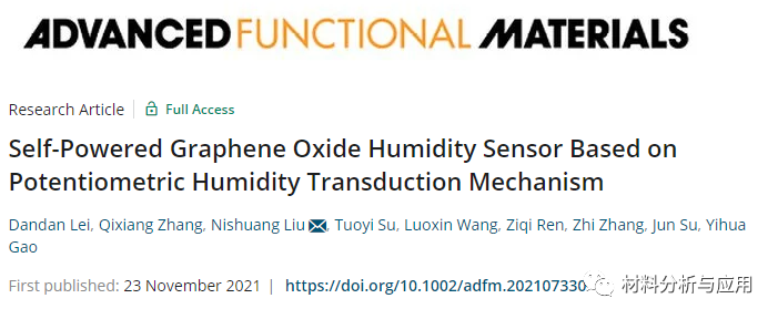 非接触式湿度传感器已被广泛探索为物联网和人工智能的人机交互。然而,除了现有的传感机制,如电阻式、电容式和基于官能团梯度的器件外,很少有人关注开发具有新颖特性的新型传感机制,以满足小型化和集成化的要求。本文,华中科技大学刘逆霜副教授团队在《Advanced Functional Materials》期刊发表名为“Self-Powered Graphene Oxide Humidity Sensor Based on Potentiometric Humidity Transduction Mechanism”的论文,研究提出了一种新的电位湿度转换机制,该机制通过对氧化石墨烯(GO)固体电解质的湿度刺激来调节两个电极之间的测量电位差。