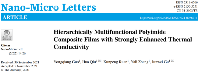 Guo, Yongqiang, Qiu, Hua, Ruan, Kunpeng, Zhang, Yali, Gu, Junwei. Hierarchically Multifunctional Polyimide Composite Films with Strongly Enhanced Thermal Conductivity. Nano-Micro Lett. 2021. DOI: 10.1007/s40820-021-00767-4.