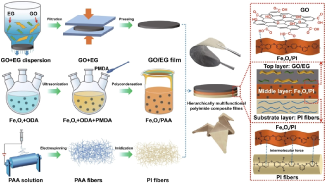 文章要点1:在本文中,通过多级设计和组装策略,作者成功制备出一种多级多功能的聚酰亚胺(PI)复合薄膜,该薄膜采用氧化石墨烯/膨胀石墨(GO/EG)作为顶部导热和EMI屏蔽层,Fe3O4/聚酰亚胺(Fe3O4/PI)作为中间EMI屏蔽增强层,电纺PI纤维作为基底层以提升力学性能。