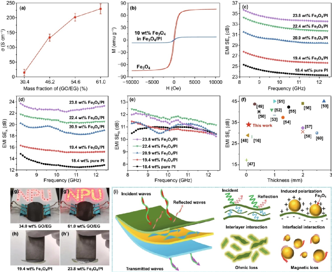 图3.PI复合薄膜的EMI屏蔽性能与机制。
