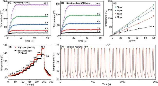 文章要点3:测试表明,GO/EG含量为61.0 wt%和Fe3O4/PI含量为23.8 wt%时制备出的PI复合薄膜,表现出优异的面内导热系数(95.40 W (m K)−1)、杰出的的EMI屏蔽效能(34.0 dB)、良好的抗拉强度(34.0 dB)、以及快速的电热响应(5 s)。